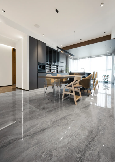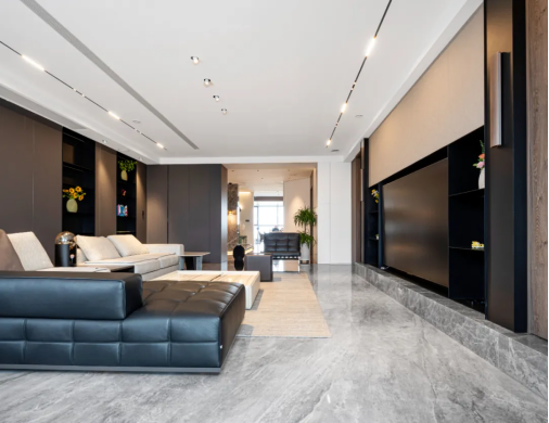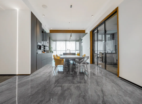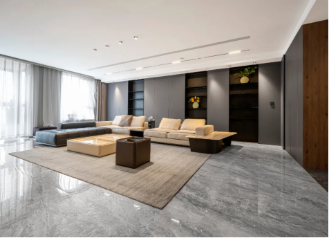 在客厅,高级灰作为一种沉静低调的主色调,为空间内部的硬装、软装调和出恰到好处的氛围感。客厅地面采用了简一云朵灰连纹密缝铺贴,自然舒展的大理石纹理疏密相间,让空间更显纯净。落地窗的设计将室外自然景观融入空间,阳光下的轻纱,也为客厅增添了舒适的柔和感,营造出视觉上的极简之美。软装布置上,线条简洁的皮革沙发、茶几摆件,格局错落有致的深色墙柜与绿植装饰相映成趣,使宽阔的客厅空间视觉层次更为饱满,传递出一种柔和宁静、稳重舒适之感。
