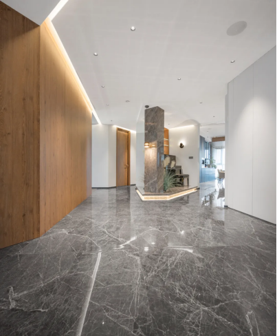 从入户门进入,第一眼感受的就是看似简单却很有设计感的装修风格。黑白灰极简走廊空间加入了原木墙面设计,明黄的木色材质,温润的质感,烘托出柔和舒适的氛围,也提升了走廊空间的整体亮度与艺术气质。走廊地面采用简一阿波罗灰密缝连纹铺贴,瓷砖的光泽深沉柔润,调性亲和的高级灰底色上,错综交织的纹理自然延伸,使整个地面看起来优雅温厚,也使整个区域的视觉效果看起来更为通透,同时质感与层次兼具,不占用过多的空间却更显简约之美。