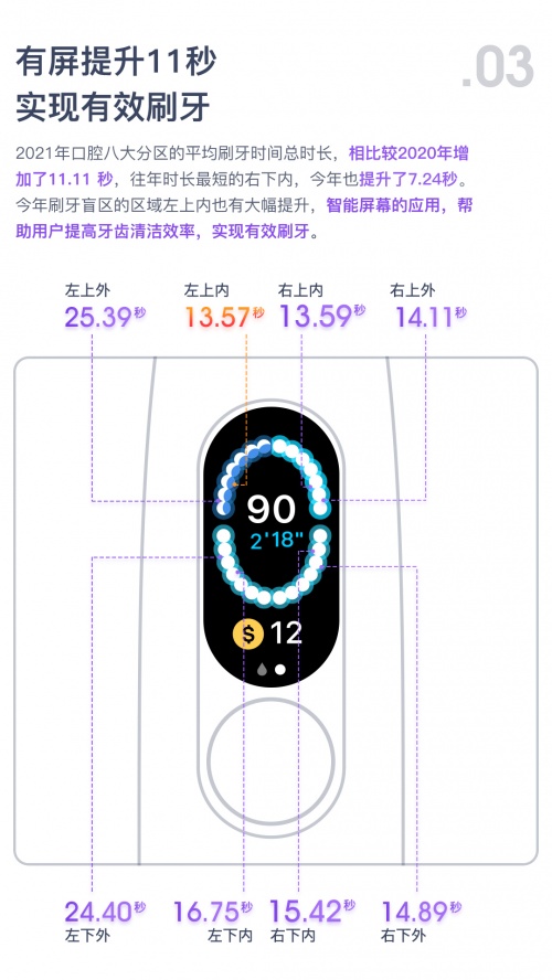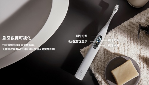 以Oclean欧可林智能牙刷为例,作为智能牙刷的引领者,Oclean欧可林在旗下产品中加入了屏幕交互功能,能够在用户清洁之后实时反馈刷牙结果等信息,并借助机身内置智能传感器,通过对用户刷牙时的手势、位置、时间、力度等数据进行大数据计算,将刷牙结果以图形方式显示在屏幕上,白色区域表示有效刷牙,蓝色则表示无效刷牙或者刷牙不到位,通过可视化互动提醒用户补刷或者下次刷牙时重点关注。