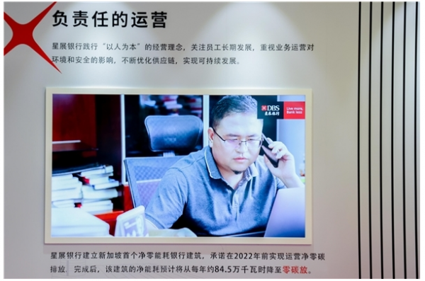 “负责任的运营”主题展区列示了星展银行在星加坡建立的首个净零能耗银行建筑,其为员工提供包容性的工作环境,关注员工长期发展;同时积极管理碳足迹,力求优化自身供应链实现可持续发展。