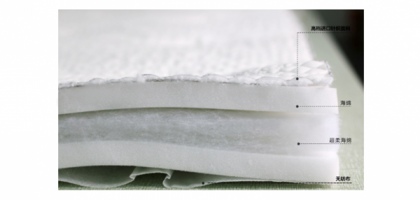 对于很多好的进口品牌的床垫来说,面料其实不只是一层布料,而是表面的复合布料+填充物+无纺布,基本就是下图中这个样子的。甜蜜坊一般都是面料+多层海绵或其他材料的复合物,更注重睡眠直接感受(下图是甜蜜坊的面料侧剖图)。