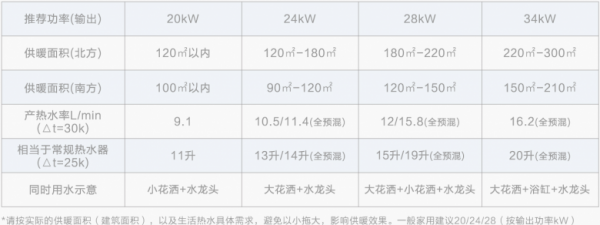 下图是壁挂炉输出功率对应的供暖面积等相关技术参数,消费者可以参照选择。