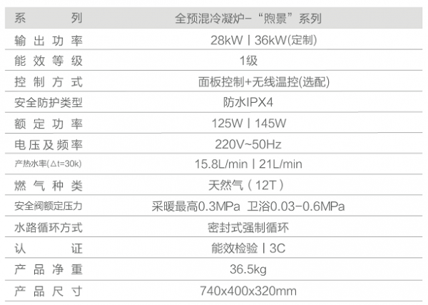 煦景系列为28KW的标准产品,同时提供了大功率36KW产品定制,可以满足工程用户的需求。下图是煦景的技术参数。