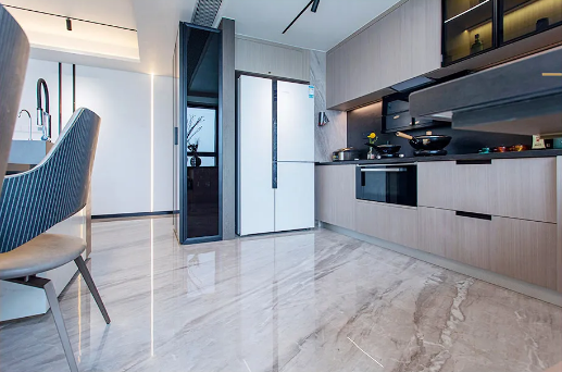 玄关处以灰白色作为主色调,给人一种干净简洁的感觉;地面沿用简一希腊灰大理石瓷砖进行密缝铺贴,以浅灰色为底色,砖面上分布着一些深浅不一的灰色纹理,自然细腻,高度还原了天然大理石的色泽和质感。一走入玄关处,密缝铺贴的效果就让人眼前一亮,同时也奠定了整屋时尚大气的基调。
