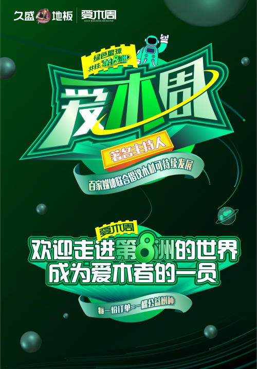 自2014年久盛推出“爱木周”品牌活动以来,每年都以不同的主题和意义呼吁更多的爱木者与久盛一起宣扬爱木、懂木、治木的理念。今年,久盛提出“绿色星球,共住第8洲”的主题,更将通过一个订单=一份公益,号召消费者们为绿色、健康、美好空间提供更多的力量。