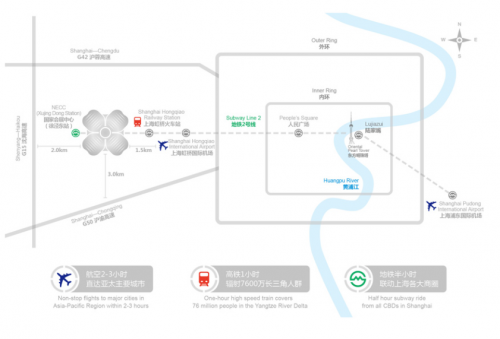 国家会展中心(上海)地处长三角核心腹地,坐落在上海虹桥商务区核心区西部,与虹桥交通枢纽直线距离仅1.5公里,通过空中连廊、地下通道及地铁2号线与上海虹桥火车站、虹桥机场紧密相连,周边高速路网四通八达,1至2小时可到达长三角各主要城市,航空2至3小时可直达亚太主要经济城市。