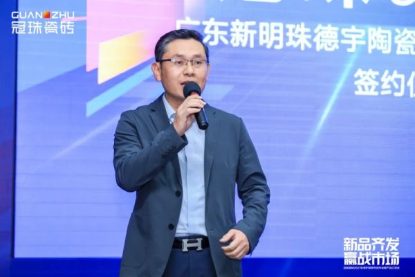 广东新明珠德宇陶瓷艺术设计有限公司总经理吴创宇先生,对本次签约发表了简单的致辞和分享,他表明设计驱动产品品类创新,通过艺术设计与创新工艺将传统文化和时代美学融入到岩板之中,拉近与消费者的情感共鸣,是塑造产品价值的重要手段。相信本次和佛山瓷砖品牌冠珠瓷砖的合作,双方定能协同发展,充分发挥资源优势,共启岩板艺术设计新篇章。