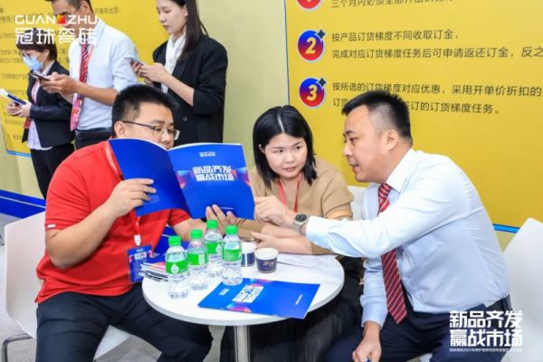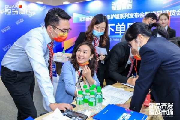 在产品展示专区,上百款硬核新品集结,现场嘉宾赞不绝口,优惠的新品订货政策更是让各位经销商按捺不住激动的情绪,纷纷敲响锣鼓踊跃订购,签约场面一度火爆,订货开始不到半小时成交额就突破1亿。活动当天,冠珠瓷砖2021秋季护墙系列产品订货金额累计达2.76亿!