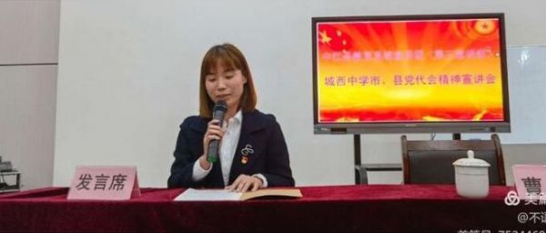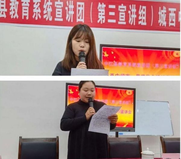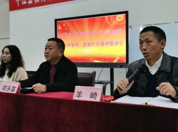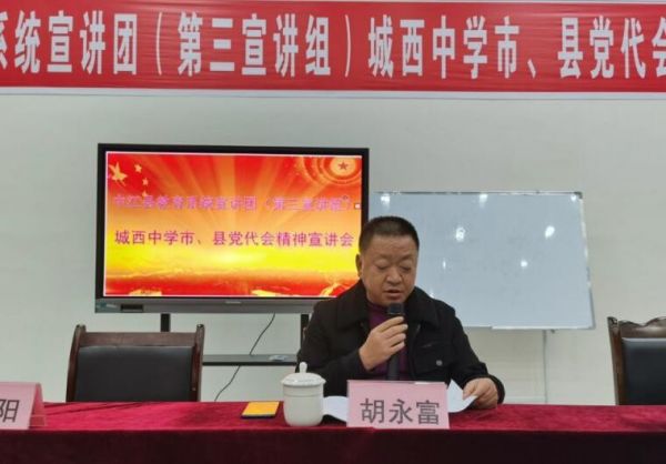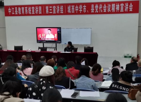 2021年10月25日下午,中江县教育系统宣讲团(第三宣讲组)成员中江县实验中学党总支书记、校长胡永富同志,教育局工会副主席曹阳同志莅临城西中学,对市、县党代会精神进行宣讲。会议由城西中学党总支书记、校长羊崎同志主持,城西中学全体教师参与了此次会议。