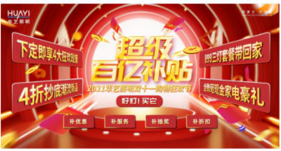下定即享4大狂欢补贴政策:补优惠,满买即减;补服务,华艺VIP客户专属服务;补抽奖,额外获得一次砸金蛋的机会;补折扣,单值买满再享额外打折!