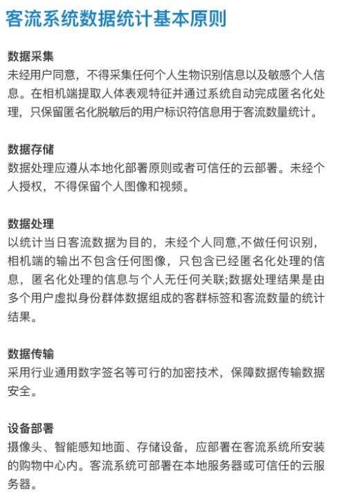 具体实施上,《购物中心客流系统数据统计规范》要求未经用户同意,不得采集任何个人生物识别特征信息以及敏感个人信息。在相机端提取人体表观特征并通过系统自动完成匿名化处理,只保留匿名化脱敏后的用户标识符信息用于客流数量统计。在数据存储上,应遵从本地化部署原则或者可信任的云部署。未经个人授权,不得保留个人图像和视频。在数据处理上,以统计当日客流数据为目的,未经个人同意,相机端的输出不包含任何图像,只包含已经匿名化处理的信息,匿名化处理的信息与个人无任何关联;数据处理结果是由多个用户虚拟身份群体数据组成的客群标签和客流数量的统计结果。在数据传输上,采用行业通用数字签名等可行的加密技术,保障数据传输数据安全。