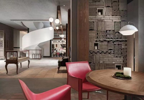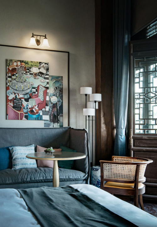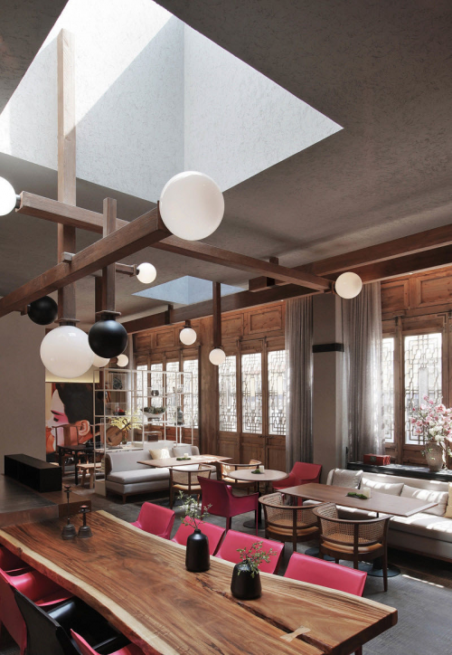 京剧艺术融汇于清中晚,盛于民初,近代西方的殖民化色彩、新民主思潮、东方封建传统,都在这个时期碰撞、交融并五彩斑斓。在古老的清代建筑里,制造新与旧、结构与装饰、东西方文化冲突。用碎片的、解构的方式来回应那个时代和诠释戏剧冲突的主题,不是形式化具体的一个个只供瞻仰的戏曲元素,而是把印象分解重构,形成逻辑的关联,重塑事物的印象,让过去和现在对话,重组一个适合当下的住宿空间。以“附生”的方式,用“盒子”构成,把新的功能和组织嵌入古建结构中,装饰依托功能,被装置式的置入,营造“共生”关系,而不是拆移式的“重塑”。传统的斗拱结构,结合寓意京剧凤冠上的云珠及剧院后台化妆灯的灯具,形成串联所有不同空间的装饰线索,并成为空间结构的一部分。戏曲的场景、人物、色彩被抽象化,运用到家具、陈设、灯具、导视系统之中。塑造一个“暧昧”,而主题不具体具象的空间,一如案名《西厢和中国传统曲目《西厢记》的多重解读。