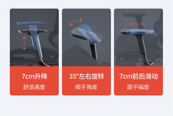 3D扶手增加联动后仰功能,椅背后仰时扶手亦可以跟随底座和椅背运动,时刻保持手臂的有效支撑。解决大家在使用时出现后仰时手臂无法得到有效支撑的问题。3D扶手支持前后上下7cm调节支撑,同时还有35度角度调节。保障手肘在不同身高、不同的使用状态下都能得到很好的支撑。