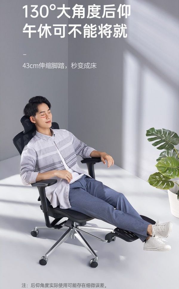 椅背支持6cm自由升降,支持三档不同高度调节。同时,3档智能后仰调节130度承托舒适入睡,支持102°、112°、130°三档的后仰姿势调节,工作时102°实力撑腰,午休时130°舒适入睡。