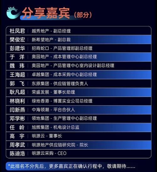 今年,将有1500位“行业最强大脑”,一同问道地产供应链未来,包括标杆房企总裁、采购总/成本总,品牌供应商领军人,地产行业联盟高层,供应链资深专家等。