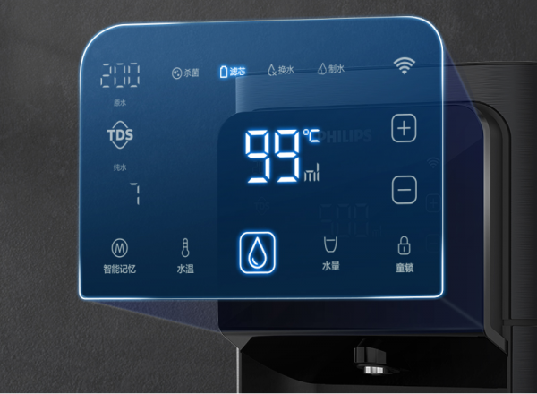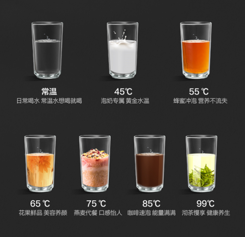还可通过轻触屏幕或APP实现无极调节水温水量: 45-99℃每1℃可调,100-999ml每50ml可选,多种水温水量随心选择,想喝就喝。
