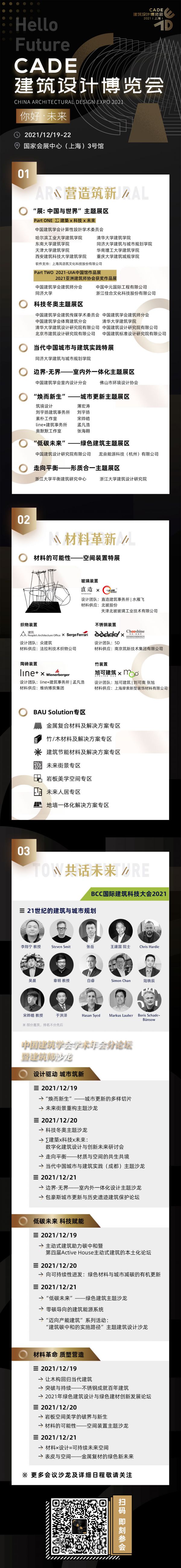 CADE建筑设计博览会(简称CADE博览会)将于2021年12月19日-22日在国家会展中心(上海)3号馆举办。CADE博览会由中国建筑学会(ASC)、慕尼黑博览集团(MMG)、中联慕尼(北京)国际会展有限公司(MMU)共同主办,是亚太首个服务于建筑师群体、定位于展示“建筑设计趋势”的博览会。