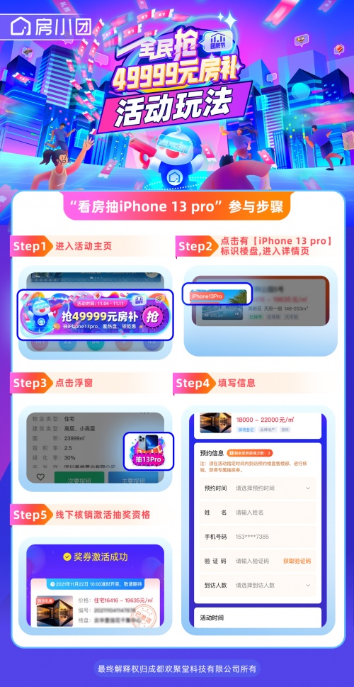 11月4日-11日,进入房小团小程序活动页,点击报名心仪楼盘参与“看房抽iPhone13Pro ”,杭州、南京11月21日前完成线下看房打卡流程,11月22日10:00活动准时开奖,成都11月30日前完成线下看房打卡流程,12月1日10:00活动准时开奖,房小团将在线下为中奖锦鲤送出奖品。