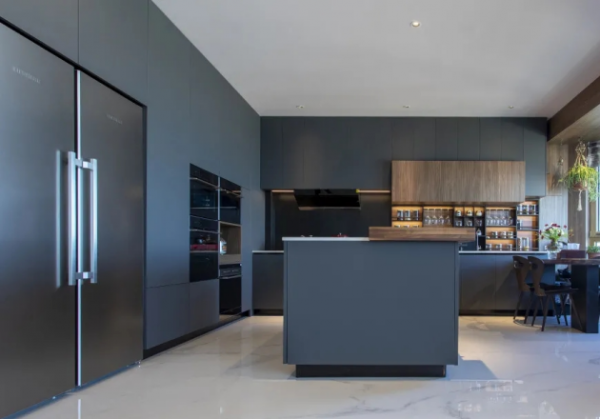 餐厨地面同样是用简一的卡拉拉白进行铺贴,奠定餐厨区简洁大气的空间基调,再以深灰色的一体化橱柜搭配白色地面,色彩明暗自然过渡,散发出意式轻奢的艺术魅力。局部采用木饰面板做点缀,并在台面摆上几盆鲜艳的花草,给空间注入活力和生机,营造出意式的温馨和浪漫感。