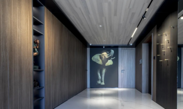 地面铺贴浅色系的简一卡拉拉白大理石瓷砖,雪白砖面上自由分布着浅灰色流纹,给人一种意式的洒脱和浪漫,搭配柔和的咖啡色背景墙,显得十分地雅致和温馨。墙中的内嵌多宝格上摆放着的工艺精湛的意式金铜雕像,以及挂在墙上的动物肖像艺术化,都使空间充满着令人着迷的意式艺术气息。