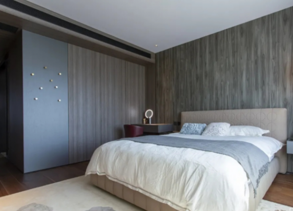 地面采用了棕色的木纹面板,上面铺了一层布艺地毯,浅卡其色的底色,暗红色的不规则纹理,给空间带来几分低调的意式奢华感。搭配浅灰色木纹面板背景墙,再用金色的圆形灯具、金色墙钉等富有浪漫色彩的配饰品做点缀,营造出自然温馨的意式空间。