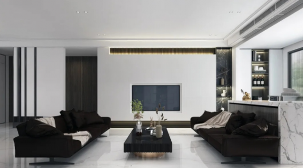现代极简风提倡摒弃一切繁杂多余的设计,通过高级配色和精良材质来打造一个美观性与实用性相结合的质感空间。装修时一切从务实出发,尽可能地精简设计中的元素、色彩、照明、原材料等,力求达到以少胜多、以简胜繁的效果。