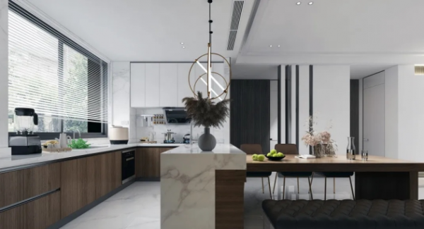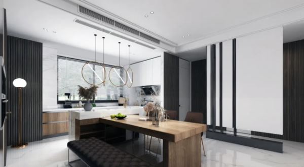 餐厅是一个充满烟火味的空间,家人每天都在这里享受美食,装修时选用简洁的色调+精良的材质,可以带来温馨和谐、优雅时尚的空间感。