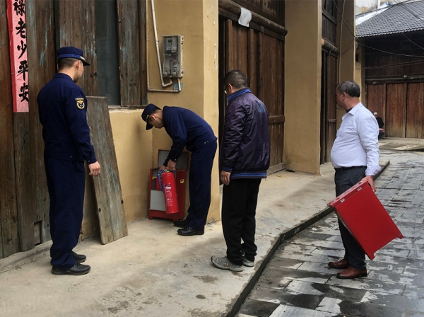 指战员与村委工作人员将灭火器和灭火器箱放置在相应的放置点