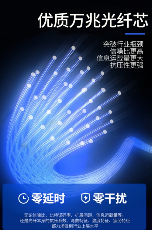 光纤HDMI线应运而生,光纤HDMI线对比传统铜芯线,有着长距离无损传输、色彩还原准确、高刷新率、音频高保真、高带宽等的优势。