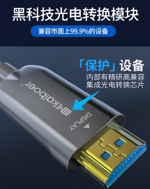 开博尔五代万兆光纤HDMI突破铜线材质30米长距传输限制,轻松过百米不受电磁干扰,采用先进的“光电转换引擎”技术,可以将电信号高效无损地转换为光信号,减少传输过程中各种信号干扰,从而实现真正的超清传输。