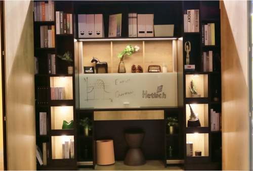后疫情时代,工作方式的变革对新型家居提出了新需求。越来越多的人选择长期在家办公,这便需要极具性价比的解决方案,既能与家居空间设计融为一体又能带来灵活的工作环境。在本次展会上,德国海蒂诗Hettich针对性推出WingLine230居家办公柜。多功能居家办公柜在门关闭时只是一个衣柜,通过WingLine 230的无下轨折叠门设计,全景式开启柜内空间,中间的置物架单元可放置书籍或装饰品,两侧空间存放衣物。门内的置物架通过 TopLine XL 顶部滑动移门系统的运行滑动,随心任意开启创意办公空间。因此,在门板关闭时,只是呈现衣柜的外观。轻轻一按,全景模式开启柜内空间,步入式的储物柜拿取物品非常便捷,当滑动中间的置物架时,原本藏在其中的办公空间完全露出,从衣柜到储物柜再到办公柜,“柜中柜”的设计让人感叹创意的精妙。