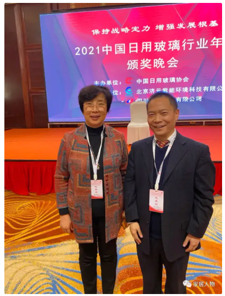 中国日用玻璃协会理事长郑舞虹(左)与美中美吕跃文董事长(右)出席2021中国日用玻璃行业年会合影