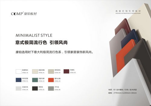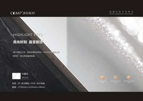 匠心品质,十年磨一剑的康铂PET板材:优选无醛级、E0级实木基材,2.745米超长尺寸,板面平整稳定,抗变形性能更是可在一门到底的设计安装中不差分毫。