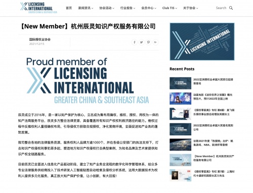 日前,知蝉网所属的杭州辰灵知识产权服务有限公司正式加入国际授权业协会。