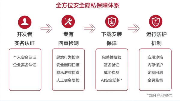 所以我最后发现,做得好的应用市场本质上都是非常注重安全和隐私的,比如华为应用市场就有一个“开发者实名认证”+“独家四重检测”+“下载安装保障”+“运行防护机制”的全方位安全保障体系,贯穿于应用上架、下载、安装和运行的全流程。一方面保证产品本身没有安全风险,而另一方面则要保证在流程上没有漏洞,不会被恶意应用钻了空子。这一点工作做的还是非常细致的,也是对正规开发者及用户的一种保护。