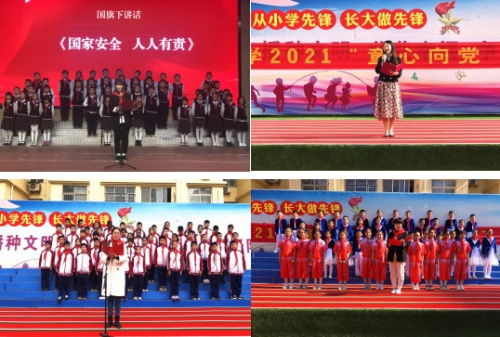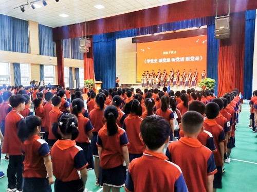 高举队旗跟党走,百年党史润童心。党带少先队,每周一国旗下讲党史,激发青少年爱国热情,坚定对党的信念。