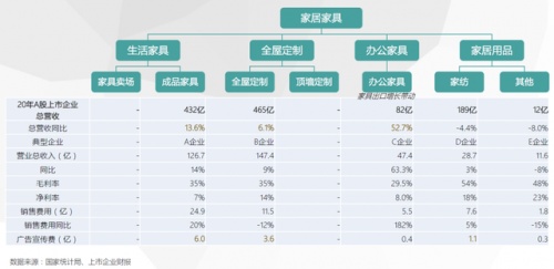 统计局数据显示,2020年我国家具类零售总额达1598亿元,同比上年下降7%;就上市企业营收看,成品家具、全屋定制及家纺的规模较大,且成品家具及全屋定制在2020年的营收逆势上涨。