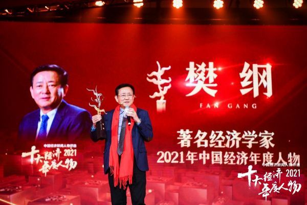 经济日报原总编辑冯并、中国经济传媒协会会长赵健作为开奖嘉宾,为樊纲开启“2021中国经济年度人物”奖。