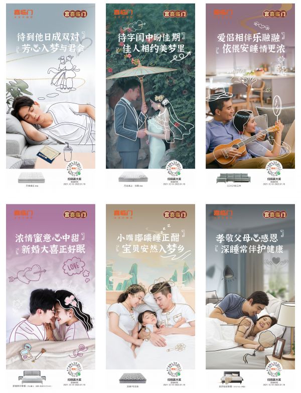 在这三组有温度的海报中,喜临门都紧紧围绕“人物群体”来进行扩展和发挥,通过这些形象化的手段为宫喜文化IP活动赋予更多的精神内涵,瞬间就博得了年轻群体的好感,使其不再是一个冷冰冰的促销活动,而是一个融入人物洞察、品牌情感温度的Party。