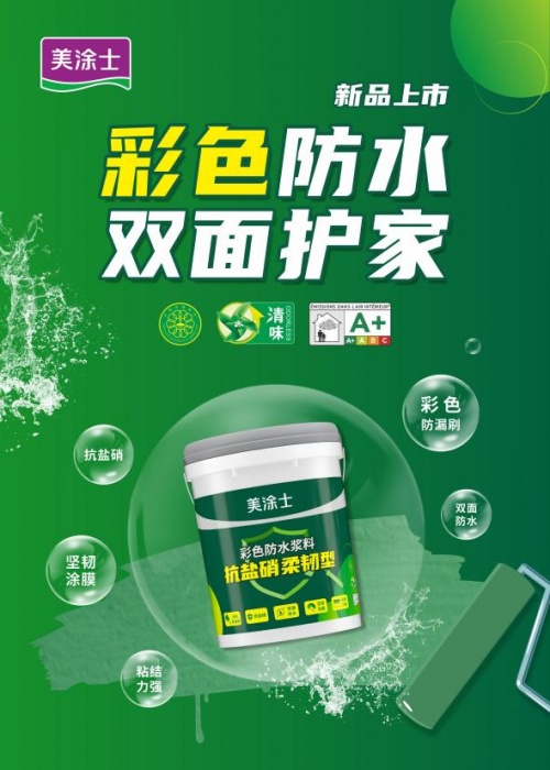 为了防止日后的生活起居中发生渗水、泛碱的情况,美涂士推出了绿色环保的美涂士抗盐硝彩色柔韧型防水。通过涂刷抗盐硝彩色柔韧型防水,让形成的防水层和基层有极强的粘结力,还能阻碍水分在基层中的渗透,故而能够起到双面防水的功效,适合卫生间、厨房、阳台等部位的防水、防潮,地下室及外墙等工程的背水面防渗、防潮处理。