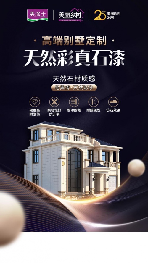 据悉,天然彩真石漆是由高性能分子乳液聚合物和天然彩砂、助剂等材料组成的厚质涂料,其外观如石头一般自然、稳重、气派并且附着牢固。在相同时间下,其漆膜的耐久性程度比传统墙漆更强,具备耐候性、抗开裂、耐划伤、耐酸碱性等功能。不仅能防止细微裂纹的产生,有效阻止水分的渗透,还能克服气候变化带来的施工应用问题,保护建筑免受开裂渗透之困。