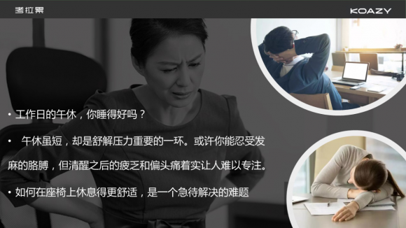 现在年轻人大多过着两点一线的生活,家到公司,宿舍到教学楼。快节奏的速度和生活学习的压力,让睡眠、心理健康几乎必定有或大或小的问题。一天除了在寝室或家里,就是在办公室或图书馆教学楼,而考拉累的头懒枕,就是为了解决坐的舒服和趴着睡的问题。