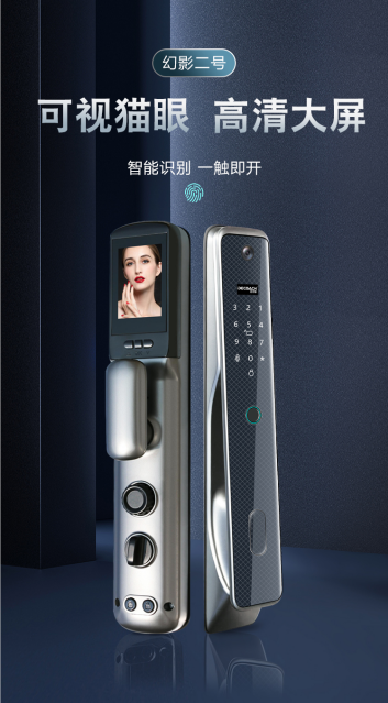 可视猫眼:内置可视猫眼,高清彩屏;访客到来,按响智能锁上的门铃,室内屏幕自动亮起,方便查看门外情况。