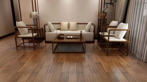 新中式偏爱以原木作为原材料,并注重木材的原生纹理和质感。在地板的选择上,以传统的红黄色、极简的原木色、和沉稳的胡桃色为主。