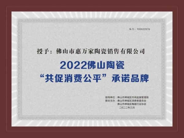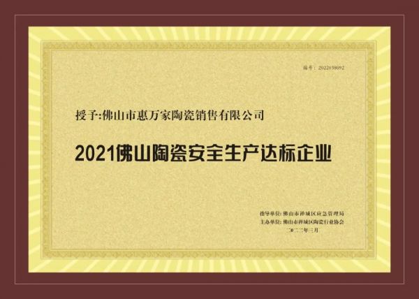 惠万家瓷砖作为行业龙头新明珠旗下的实力品牌,凭借过硬的产品质量和市场口碑,获得了2022佛山陶瓷“共促消费公平”承诺品牌和2021佛山陶瓷安全生产达标企业两项殊荣。
