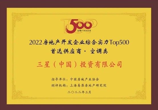 近日,中国房地产TOP500测评成果发布会暨房地产发展高峰论坛圆满落下帷幕,推出房地产开发企业TOP500首选品牌测评研究报告,通过科学公正、客观、权威的评价指标体系和评价方法,评估出具有较强竞争力的房地产供应商及服务商品牌。三星中央空调凭借雄厚的综合实力与高品质的实战案例,再次荣获2022房地产开发企业综合实力TOP500首选供应商·空调类。