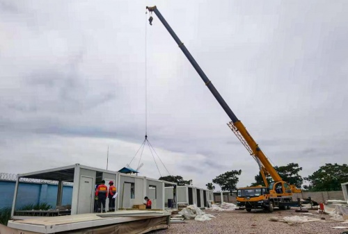 不等不靠,担当作为,项目建设有序推进。初来乍到,刚果(金)项目无固定办公居住营地,先遣队8人,顶着炎炎烈日,亲自动手开荒除草、搬砖、和水泥、砌墙、铺石子,认真建设着属于自己的新营地,2020年11月中旬首批钢构件及六合易家装配式房屋经过3个多月的海运陆续抵达刚果(金)项目现场,各项工程建设任务有条不紊展开。2020年12月初,一排排整齐的“六合易家”装配式集成房屋营地拔地而起,施工现场各个钢结构厂房建设稳步推进,项目部海外生产生活步入正轨。