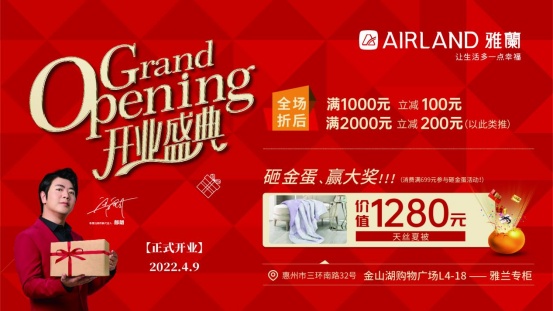 4月9日雅兰家纺「惠州金山湖中心店L4-18」于隆生金山湖购物中心盛大开业,此次新店的开业,为惠州的市民朋友们再次带来美好品质睡眠体验,演绎生活与艺术的纯粹美学,传递雅兰56年的匠心风骨、品质之美。让你的生活多一点幸福,多一些纯粹。