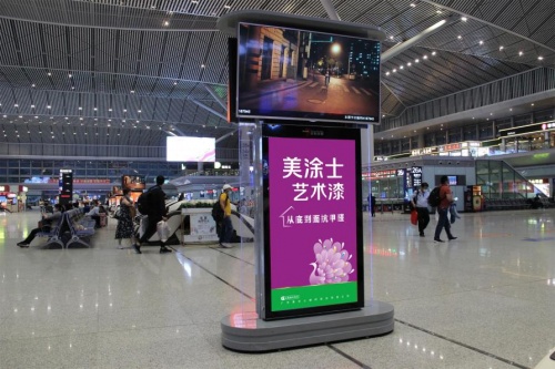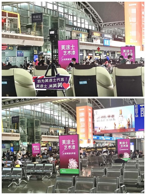 在拥挤又喜悦的五一出游路上,旅客在高铁站内抬头就能见到美涂士艺术漆广告画面,“绿地紫花”的视觉效果,“美涂士艺术漆 从底到面抗甲醛”的醒目字样,以及熟悉的品牌印象,成为高铁站里一道亮丽的风景线!