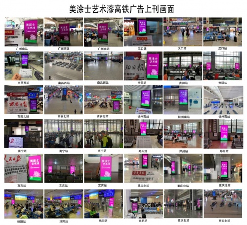 五一出游高峰期间,美涂士艺术漆“从底到面抗甲醛”广告霸屏横扫全国核心枢纽重点高铁站,上百个途径站点以及终端媒体,美涂士艺术漆高铁广告实现全面投放,抢占品牌传播高地,触达全国十三亿精准流量!这波操作视觉冲击力强、广告触达率高,具有无可比拟的品牌展现优势,为美涂士品牌注入新势能!